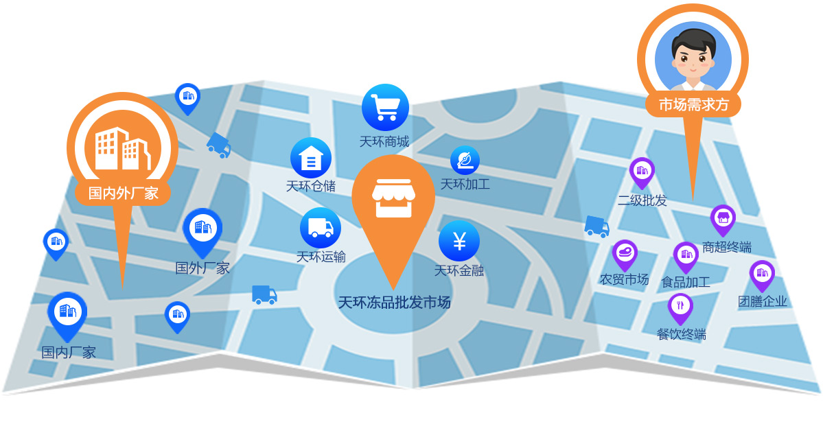 天環(huán)商城是依托于線(xiàn)下實(shí)體批發(fā)市場(chǎng)而搭建的一個(gè)專(zhuān)注在冷凍食品供應(yīng)鏈的B2B電商平臺(tái)。